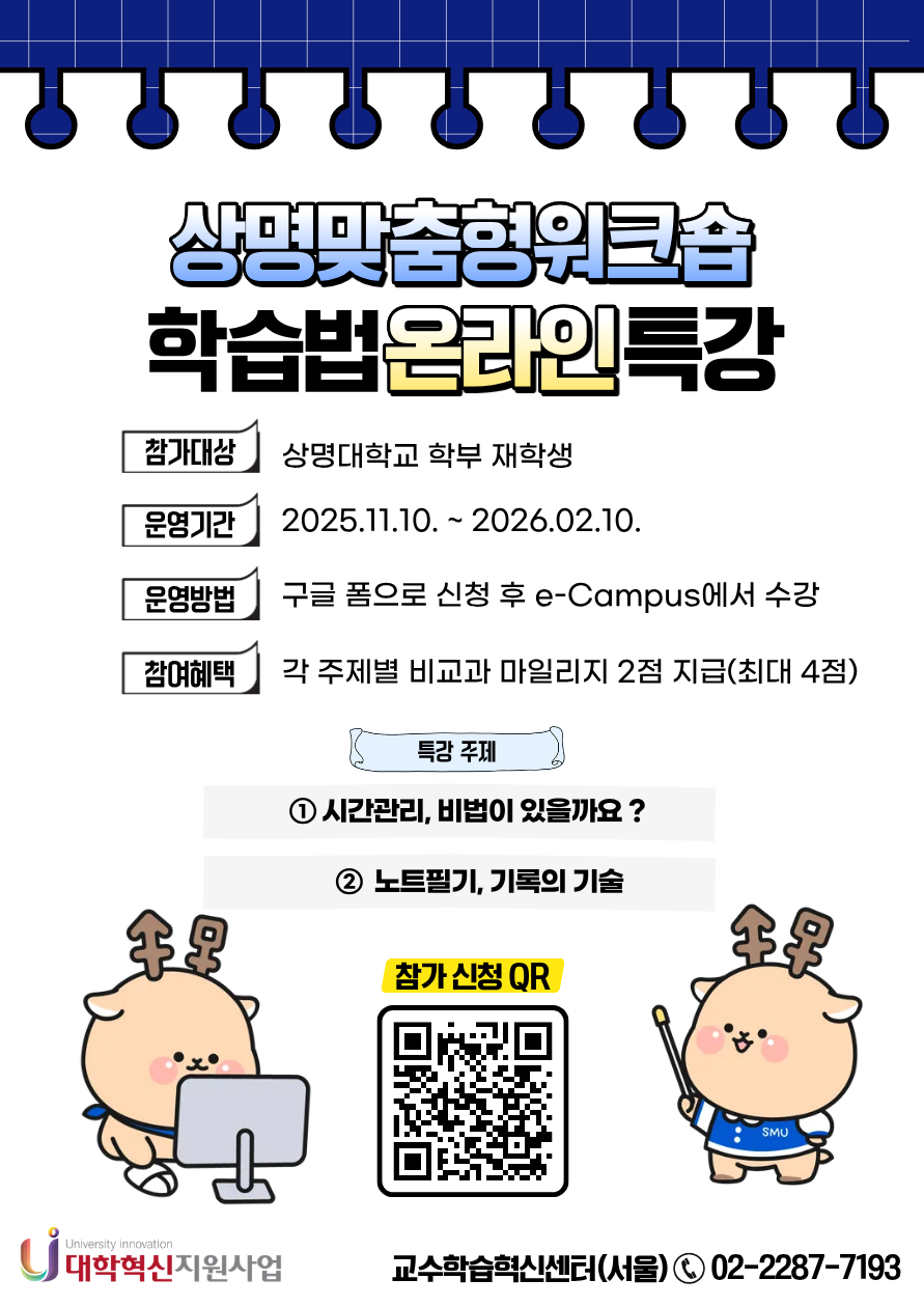 | 상명 맞춤형 워크숍 _온라인 특강 | 2025.11.10.(월) ~ 2026.01.19.(월) | 2025.11.10.(월) ~ 2026.02.10.(월) |